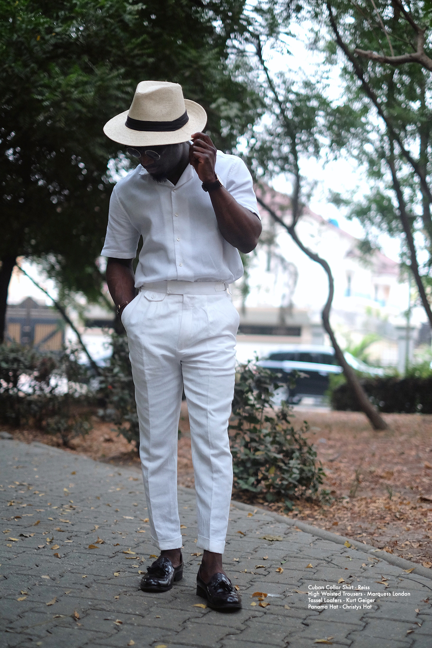 There is a complete sense of merging classic with contemporary with the high-waisted trousers and cuban collar shirt paired with a patent russet loafers and panama hat. All tailored to a modern fit and look.